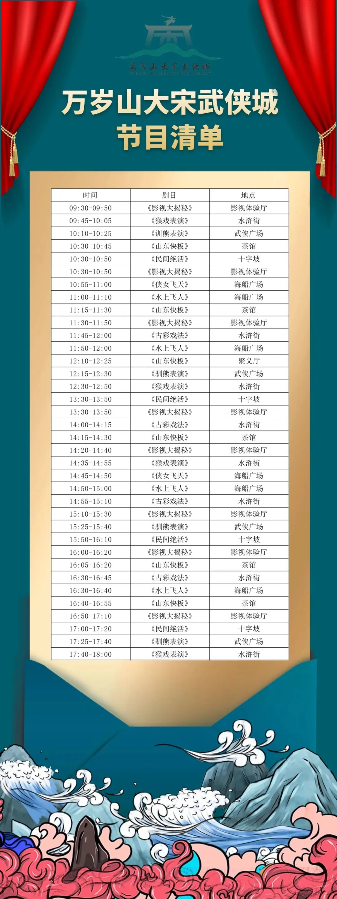 每天定时表演节目:包公迎宾、杨志卖刀、林冲怒打高衙内、梁山好汉劫囚车 、燕青打擂、李师师艺会情公子、王员外招婿 、宋式民俗婚礼、编钟乐舞、马术、气功绝活等20余个。行程结束后乘车返回温馨的家!